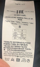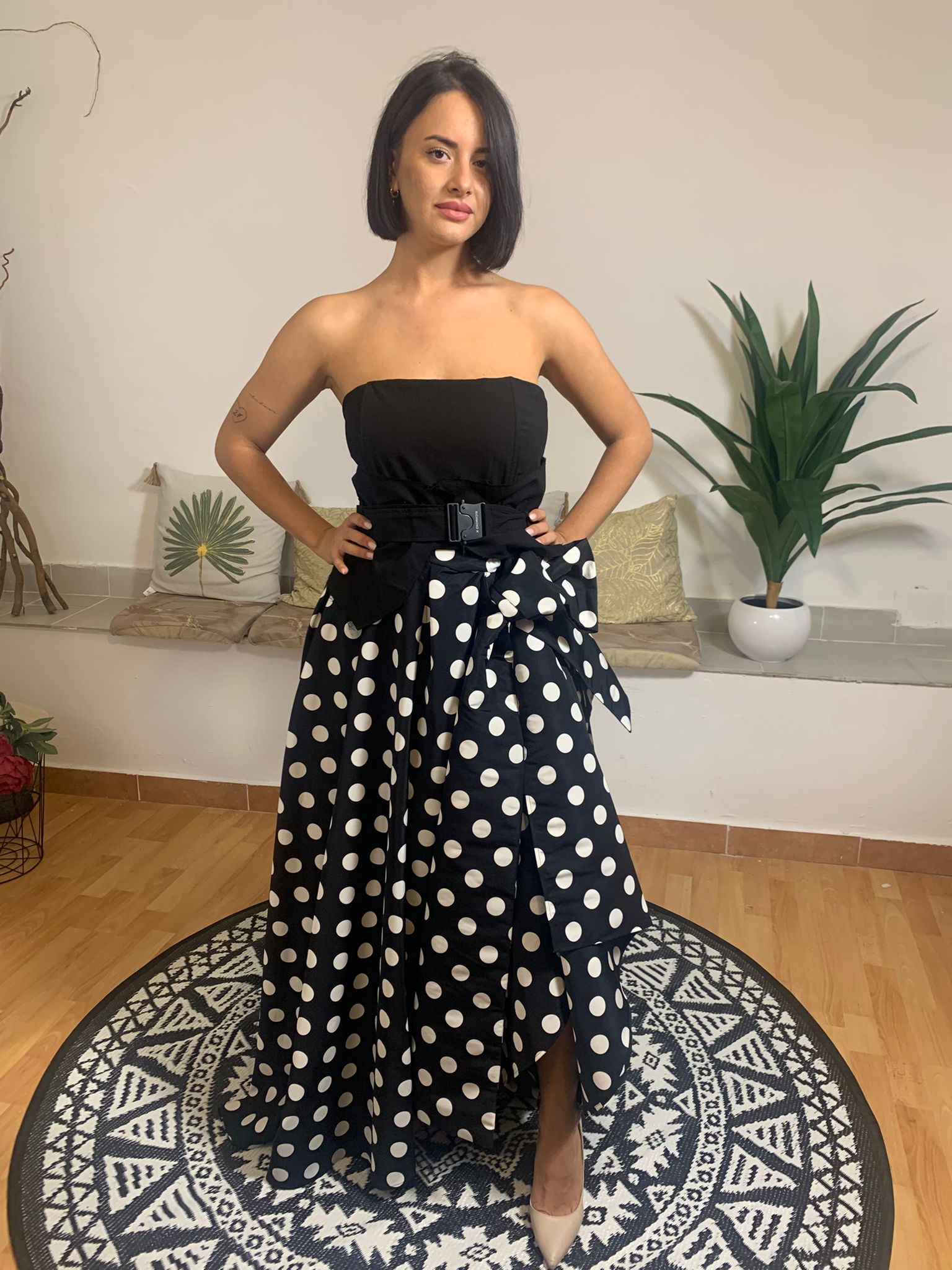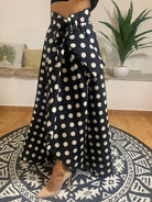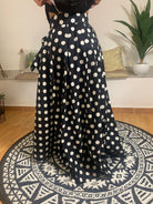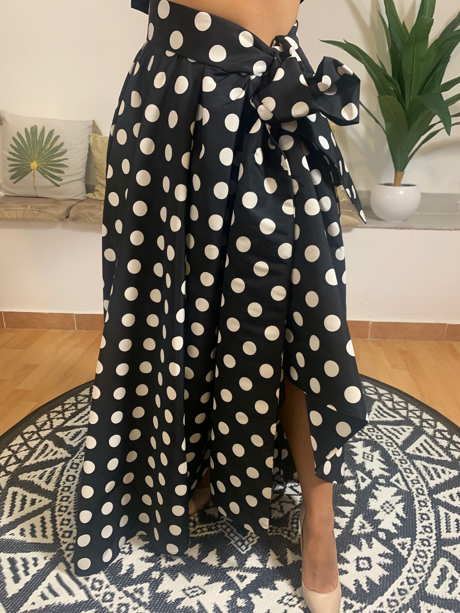 Pinko propone questo raffinato gonnellone nero con pois bianchi. Il capo presenta una chiusura frontale con un ampio fiocco che forma uno spacco, mentre il retro risulta leggermente più lungo. La modella indossa una taglia S. Composizione 100% poliestere.