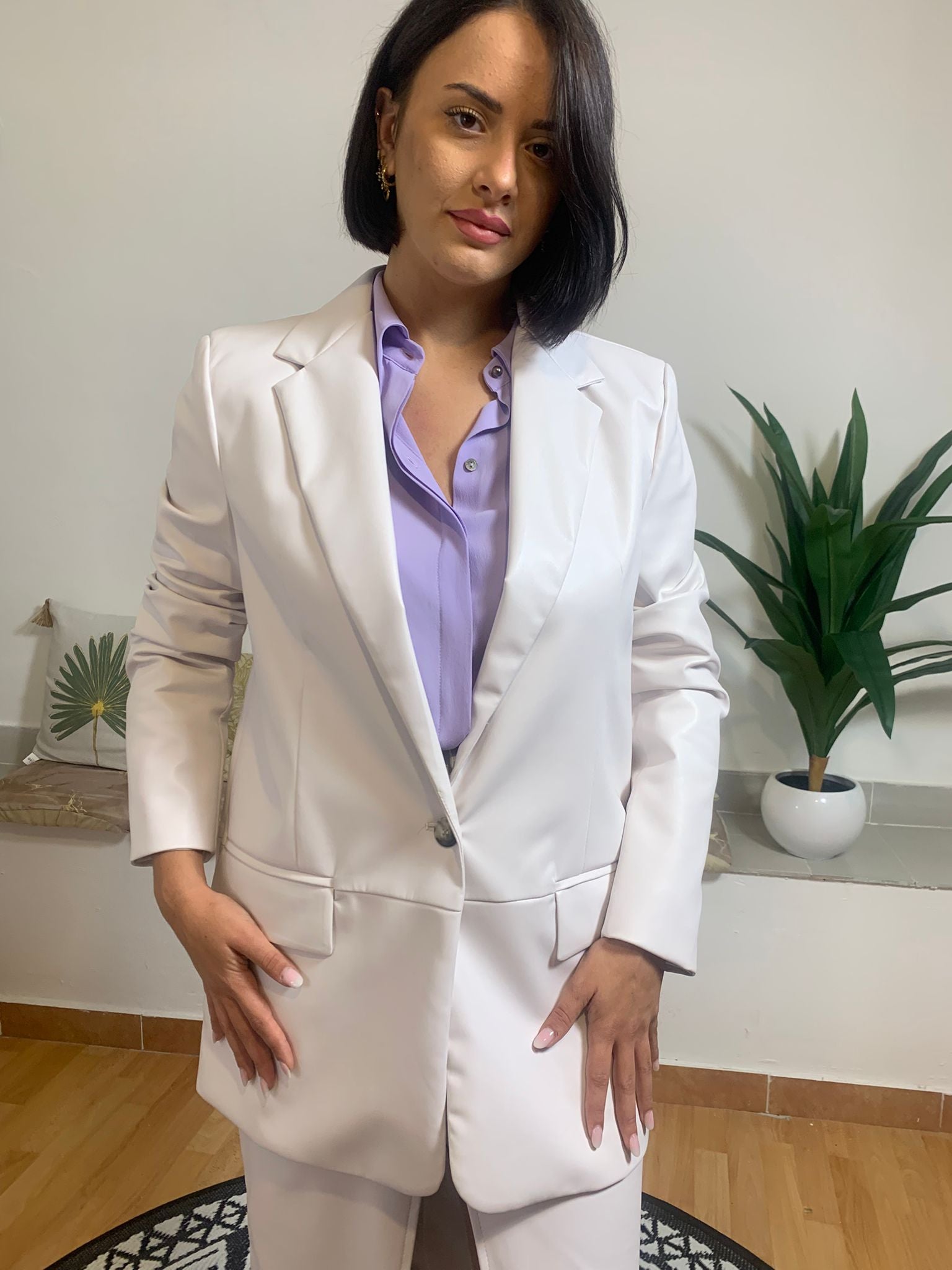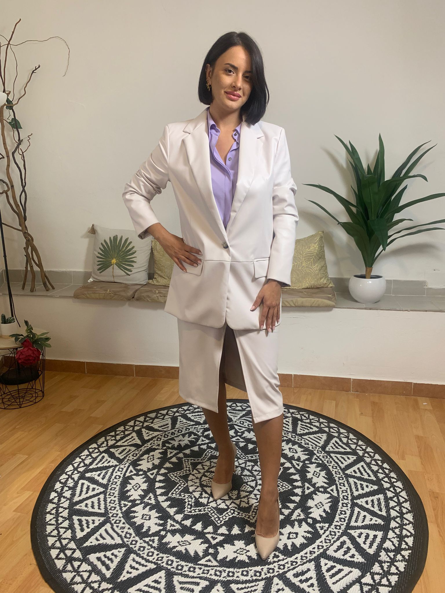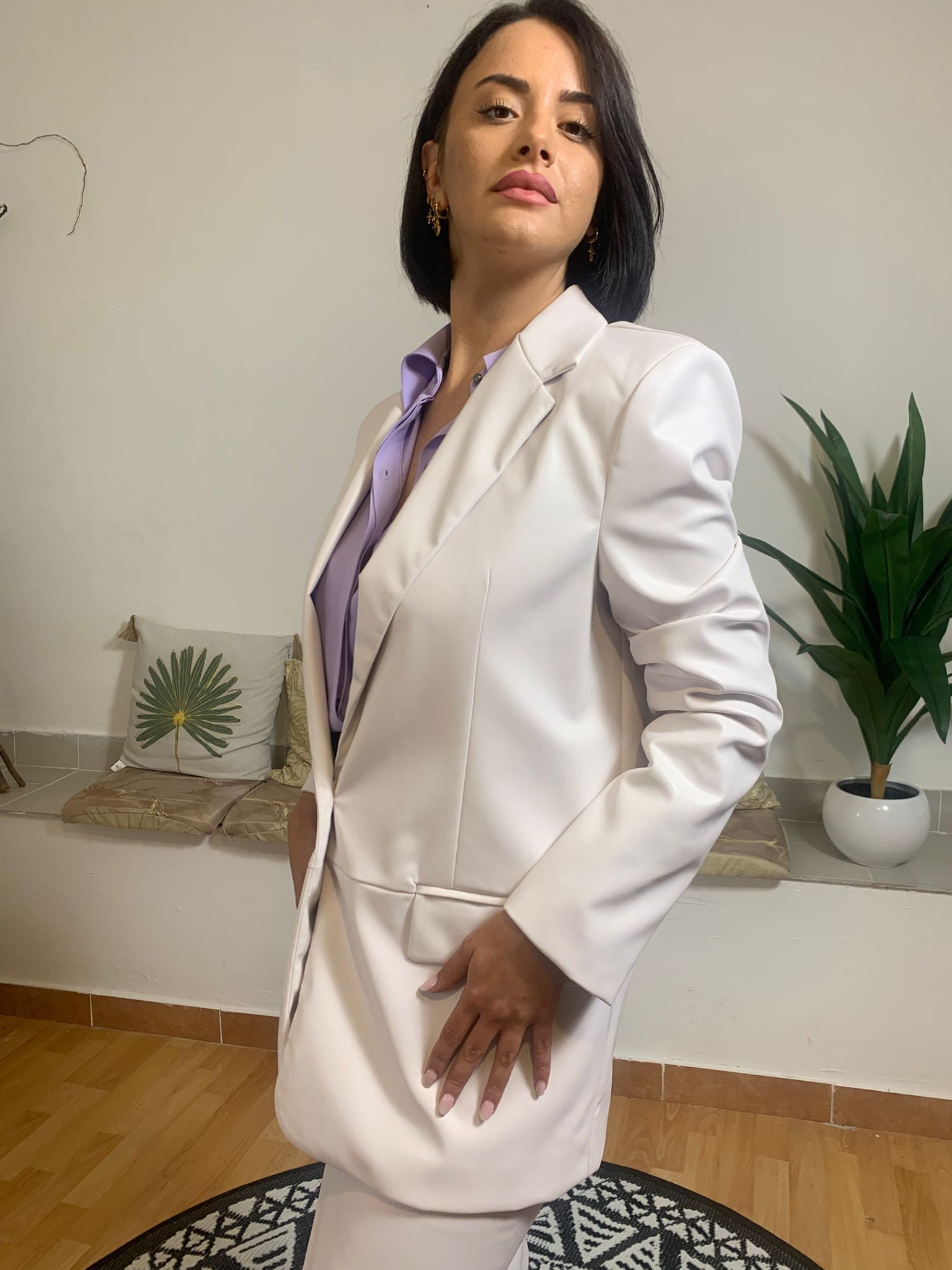 La gonna Vicolo bianca in similpelle si distingue per il design minimalista ed elegante, priva di tasche e caratterizzata da un bottone centrale sulla giacca abbinata. Realizzata con una combinazione di 50% poliestere e 50% poliuretanica per la gonna, e di 60% acetato e 40% per la giacca, garantisce comfort e stile raffinato. Il modello indossa una taglia adatta a una statura di 170 cm e un peso di 62 kg.