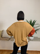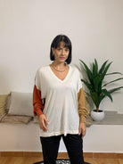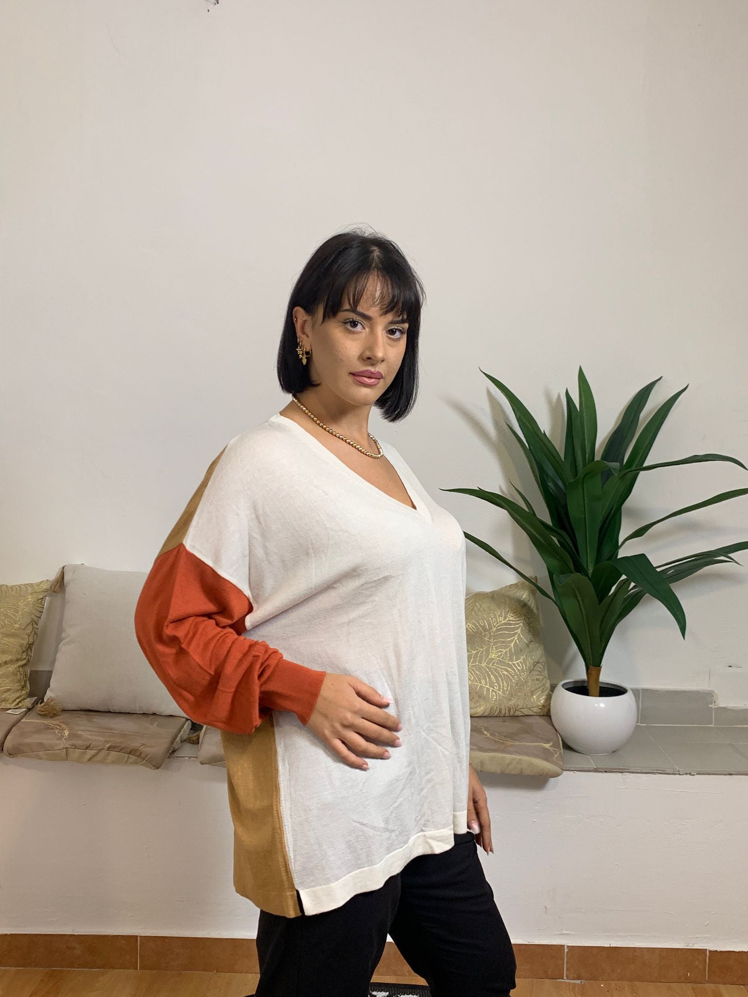 La maglia AKEP presenta una struttura a tre colori: bianco sul davanti e sul retro, marroncino su una manica e rosso sull’altra. È lunga e dotata di uno scollo a V elegante. Realizzata con un mix di materiali di alta qualità, composta per il 65% da viscosa, 26% lana merino e 9% poliammide. Il capo è indossato da una modella alta 170 cm e dal peso di 62 kg,