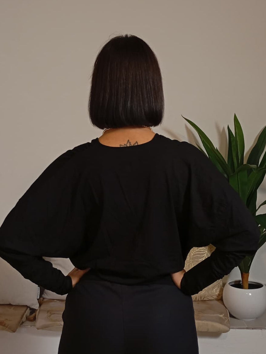 Pinko propone una maglia dal design sensuale realizzata in tessuto jersey adatto a diverse stagioni. Il capo presenta una fascia aderente sul fondo che valorizza una vestibilità più morbida nella parte superiore. Le maniche a effetto pipistrello aggiungono carattere, mentre la scollatura è completata da un bottone oro con logo. La modella, alta 170 cm e dal peso di 62 kg, indossa una taglia XS. Composizione: 95% viscosa, 5% elastan.