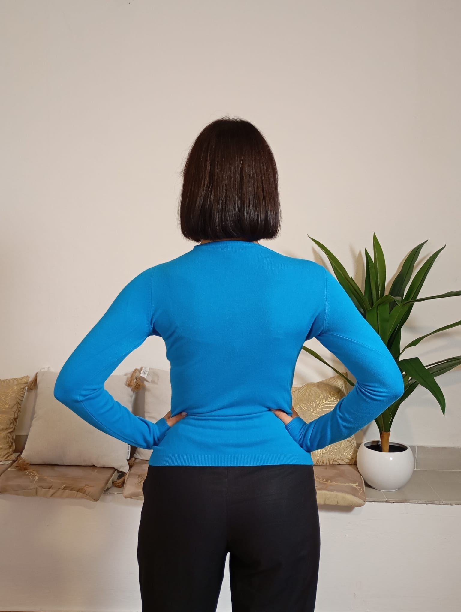 MAGLIA PEGGY HO. MAGLIA IN TURCHESE CON CHIUSURA A BOTTONI SUL DAVANTI, DALLE CARATTERISTICHE CALDE E MORBIDE. COMPOSTA DA 56% VISCOSA, 27% POLIESTERE E 17% NYLON. PERFETTA PER LA STAGIONE INVERNALE. LA MODELLA HA UN PESO DI 62 KG ED È ALTA 170 CM.