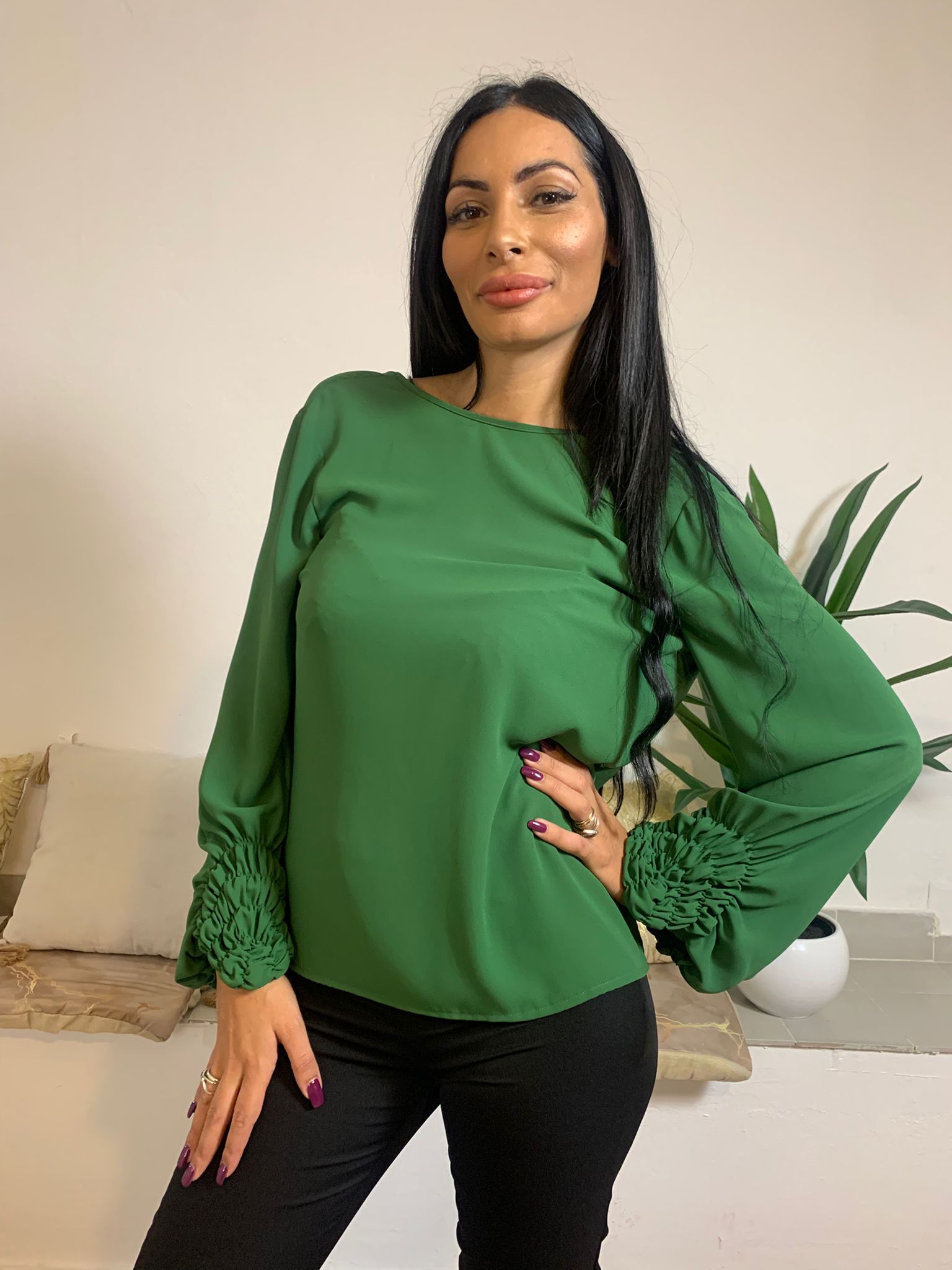 Elegante maglia in poliestere 100% che combina stile e comfort. Caratterizzata da maniche lunghe con dettaglio arriccio e uno scollo ampio che si apre sulla schiena, creando un'esilità sofisticata. La tonalità verde suoli conferisce un'eleganza naturale e versatile. Taglia 42. Indossata dalla modella di 175 cm e 54 kg per una visione accurata della vestibilità.