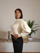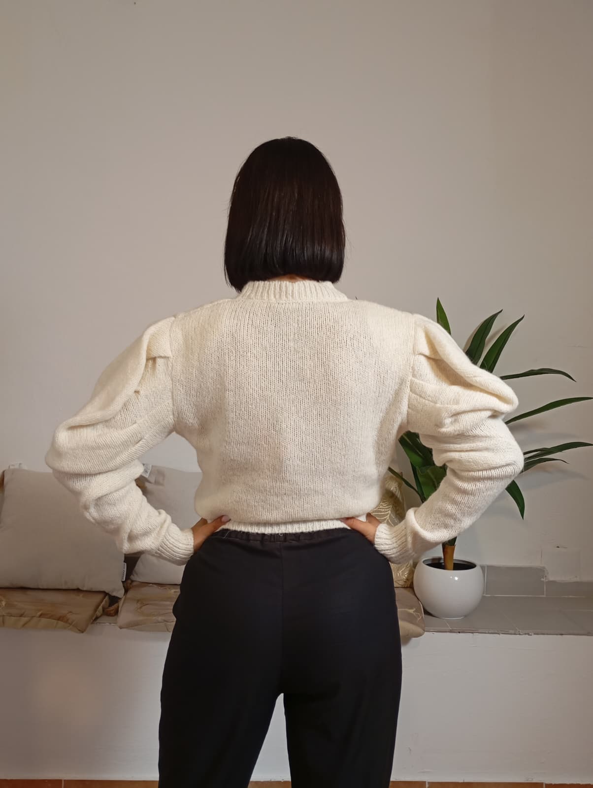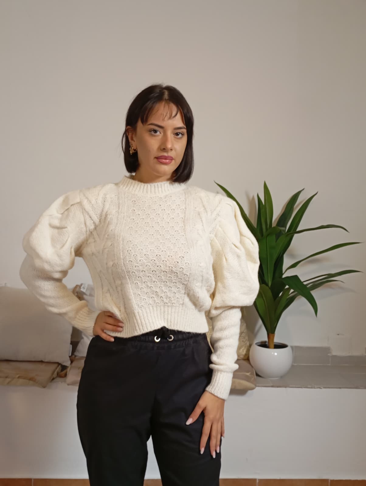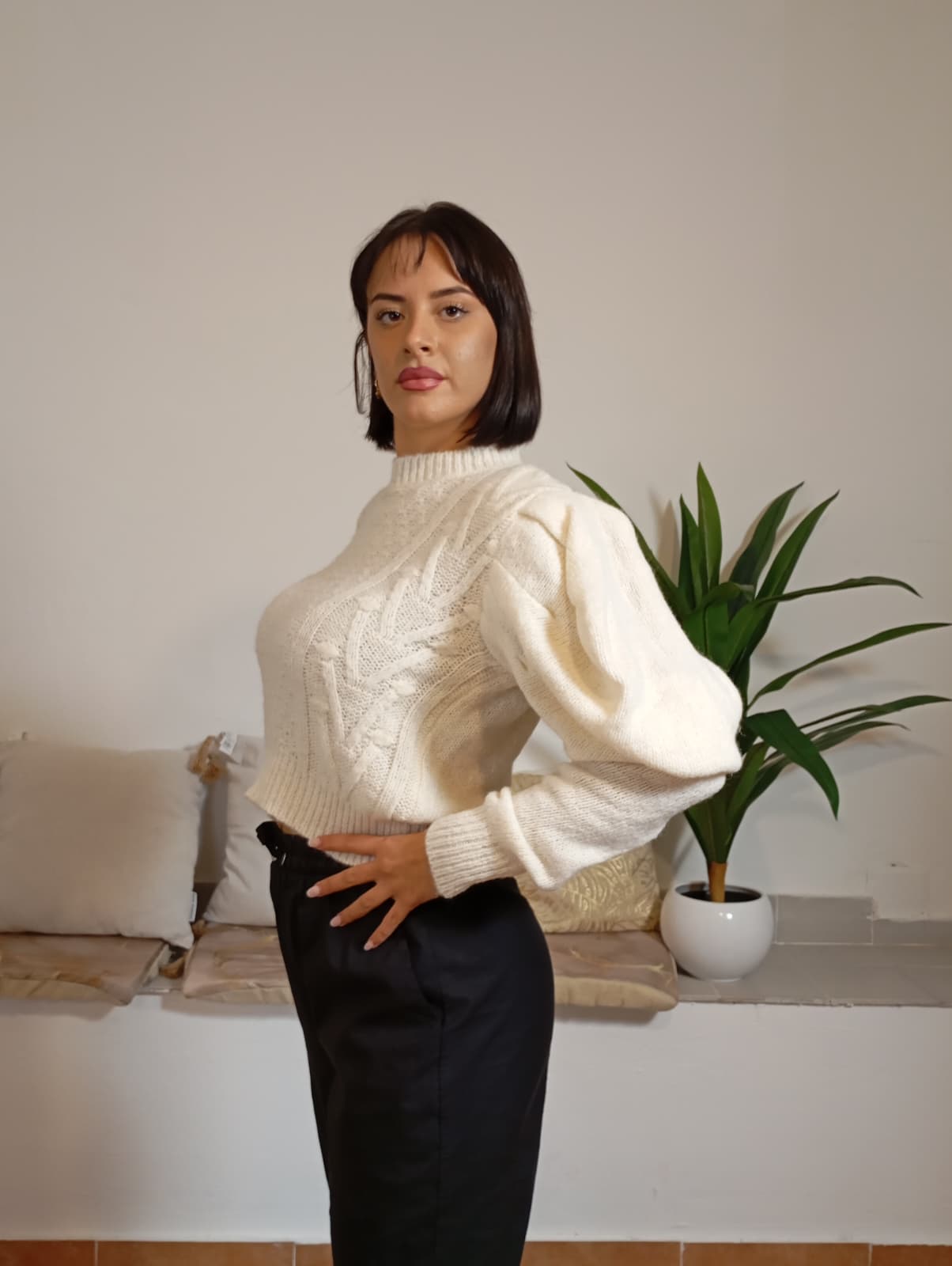AKEP propone un maglione sagomato in vita con maniche dal volume pronunciato sulle spalle, caratterizzate da un elegante effetto palloncino. Il capo è realizzato con una lavorazione dettagliata che combina trecce e punti maglia particolari. La modella, alta 170 cm e con un peso di 62 kg, indossa una taglia S. Composizione: 45% acrilico, 35% nylon, 20% alpaca.