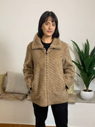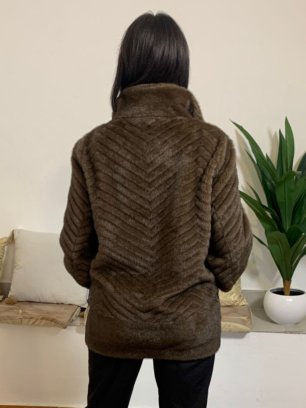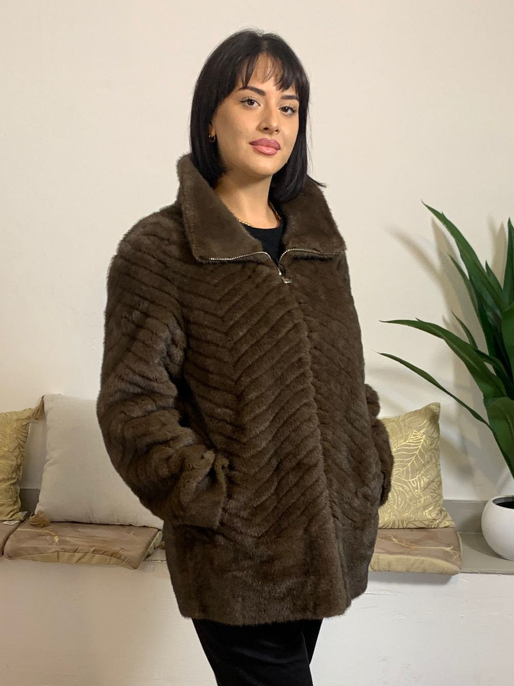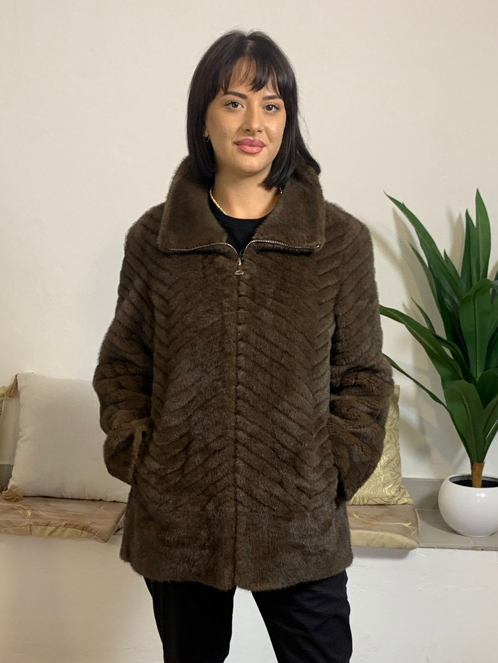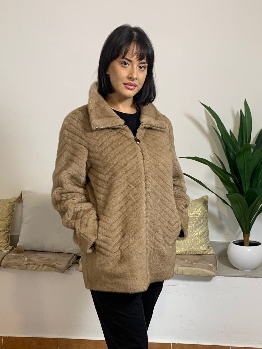 La pelliccia Peggy Ho è realizzata in eco-pelliccia 100% poliestere, con una lunghezza superiore rispetto ai modelli classici. Presenta strisce più ampie e sfumate, un ampio colletto e tasche funzionali. La modella alta 170 cm e del peso di 62 kg, indossa questo capo per esaltarne la vestibilità elegante e confortevole.
