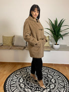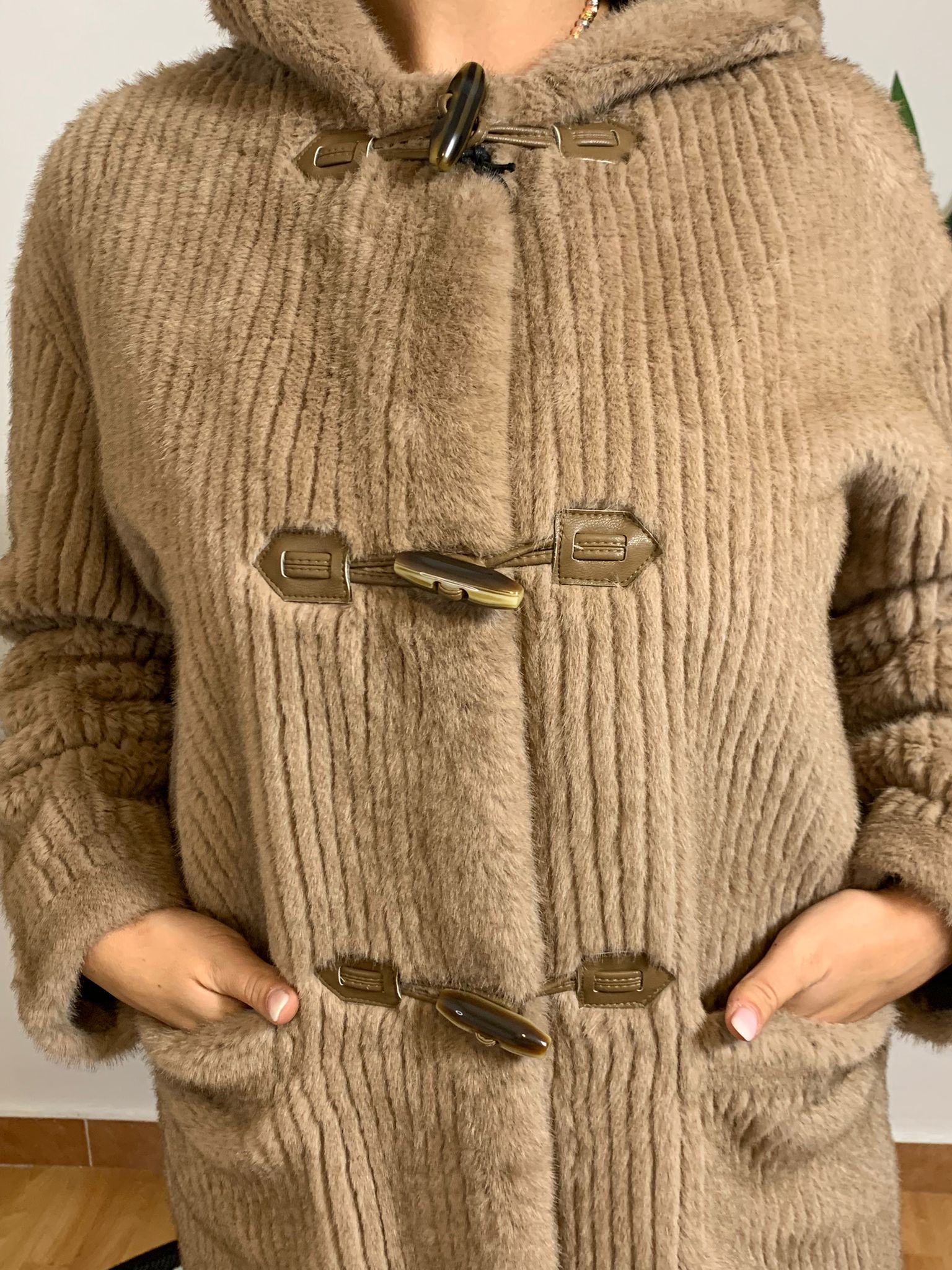 La pelliccia Peggy Ho è realizzata in ecopelliccia 100% poliestere, caratterizzata da sottili righe che donano profondità e luminosità al colore. Presenta un ampio cappuccio morbido e una lunghezza che supera il ginocchio, garantendo calore e copertura. Comoda e pratica, dispone di tasche frontali e si chiude con eleganti alamari in una nuance tra marrone e beige, per un abbinamento raffinato e versatile.
