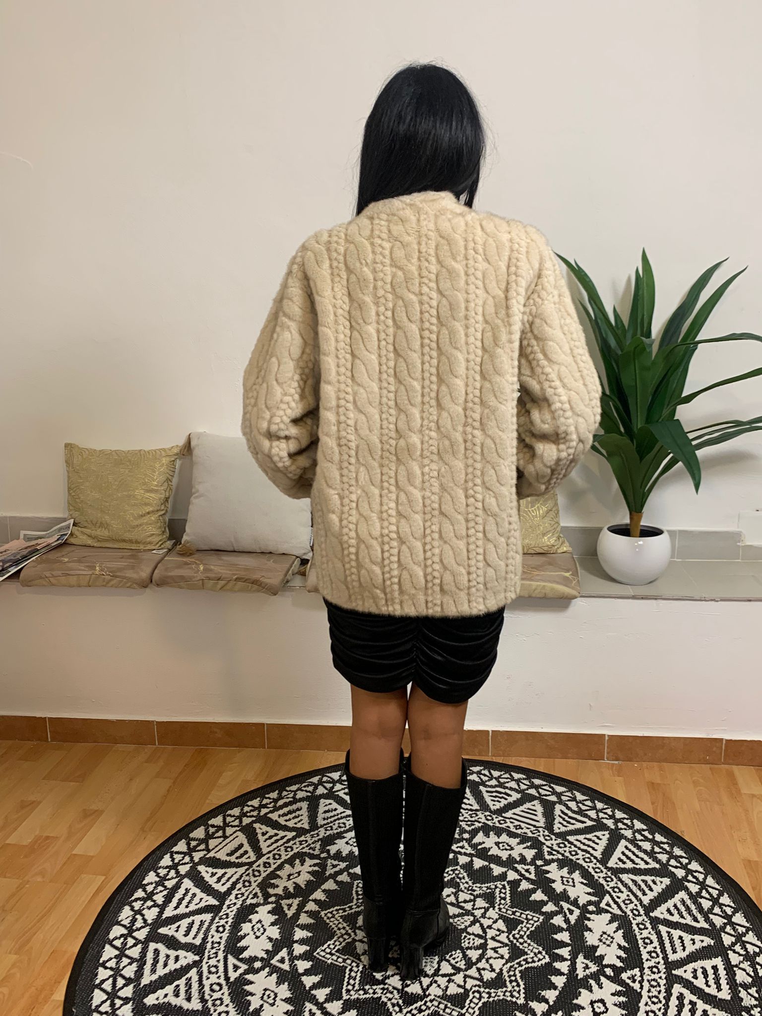 La pelliccia Peggy Ho è realizzata in ecopelle 100% poliestere e presenta bottoni dai toni che variano dal marrone al beige. Con una lunghezza che arriva fino alla vita, si distingue per le trecce e le lavorazioni dettagliate che decorano l’intero capo. La modella che la indossa è alta 175 cm e pesa 54 kg.