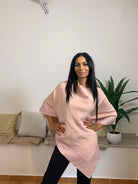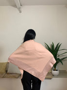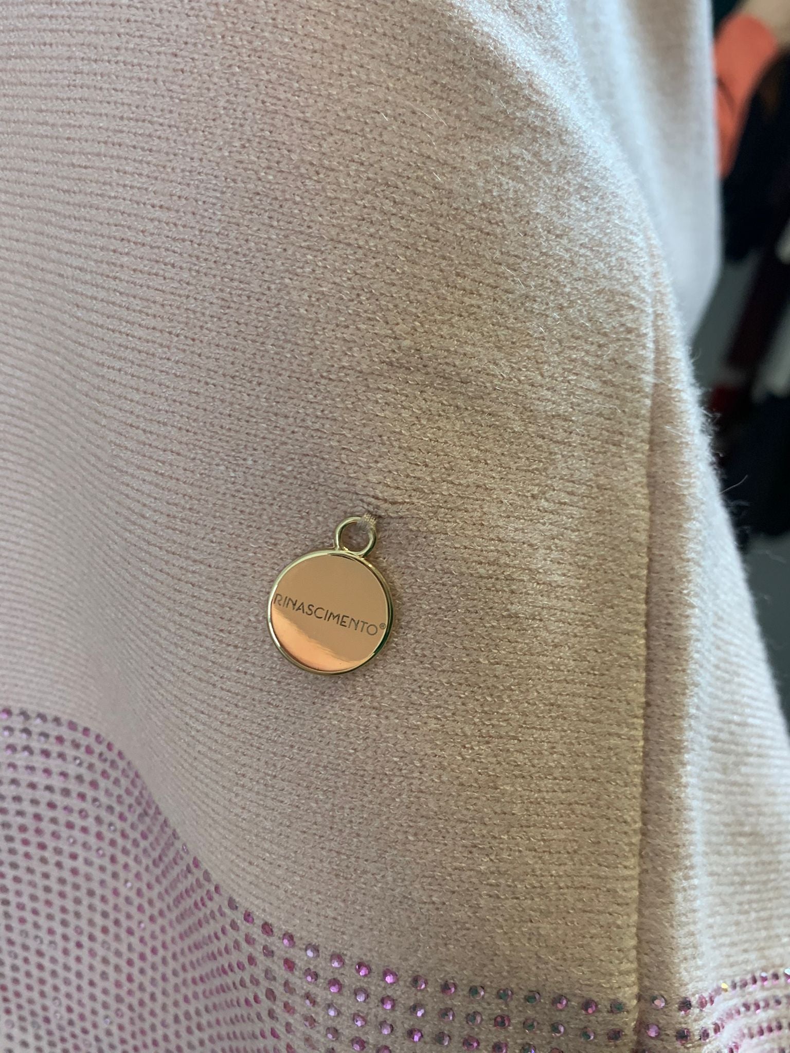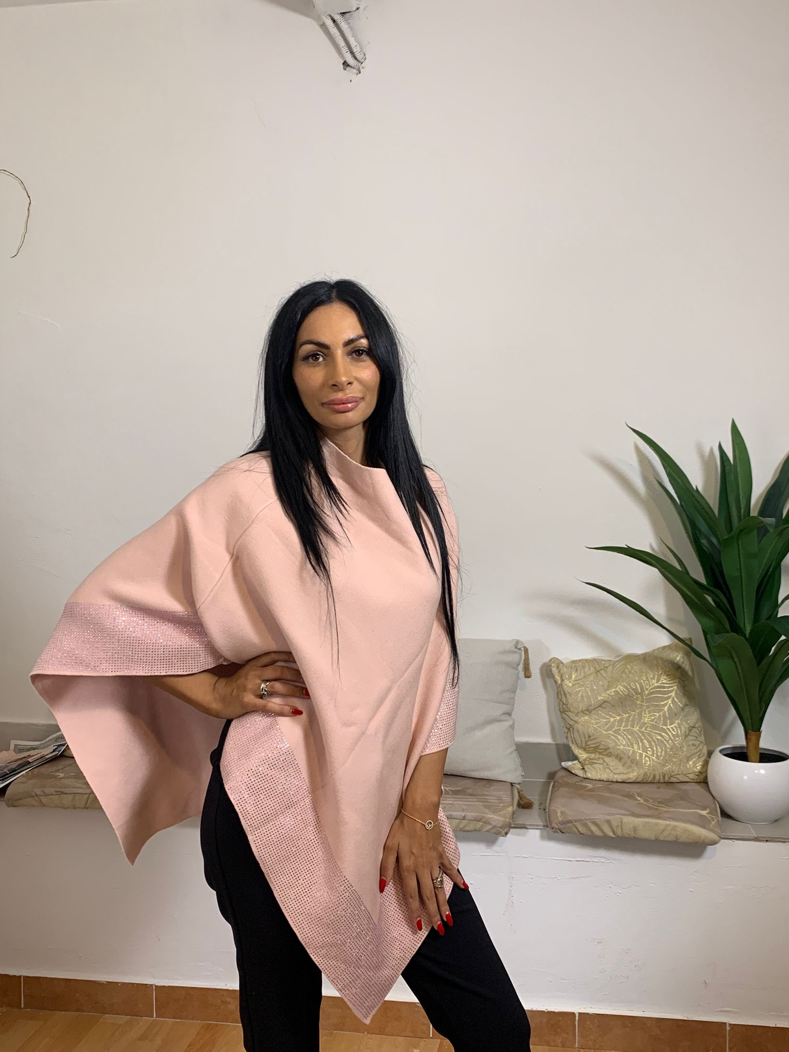 Poncho Rinascimento in rosa cipria, arricchito da dettagli scintillanti color rosa scuro lungo il bordo. Realizzato con materiali caldi e morbidi, è perfetto da abbinare a qualsiasi outfit. Sul retro è presente una piccola medaglietta con il logo distintivo del brand. La modella raffigurata indossa una taglia adatta a chi pesa 54 kg ed è alta 175 cm.