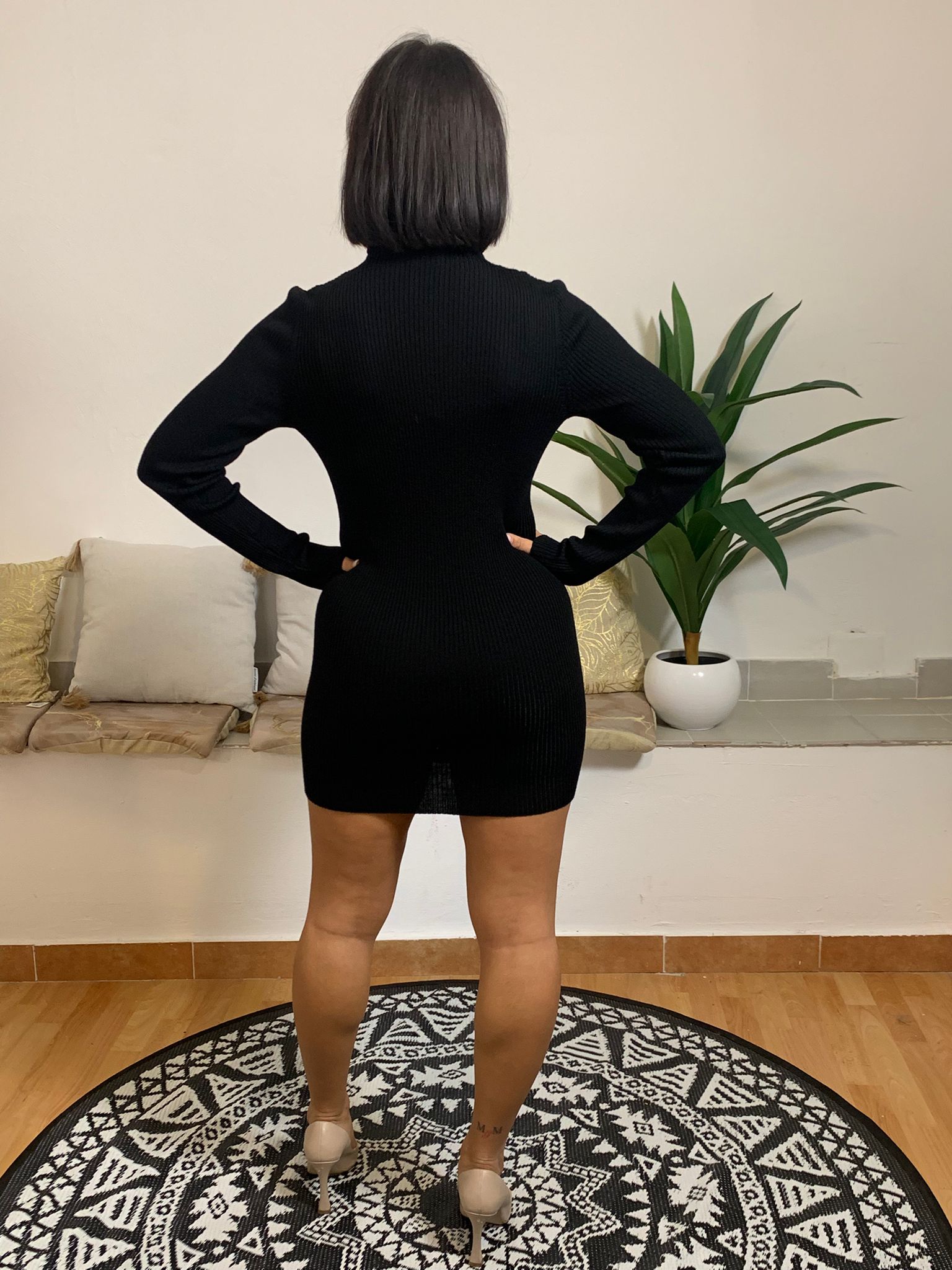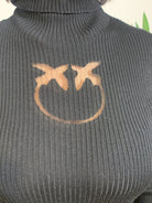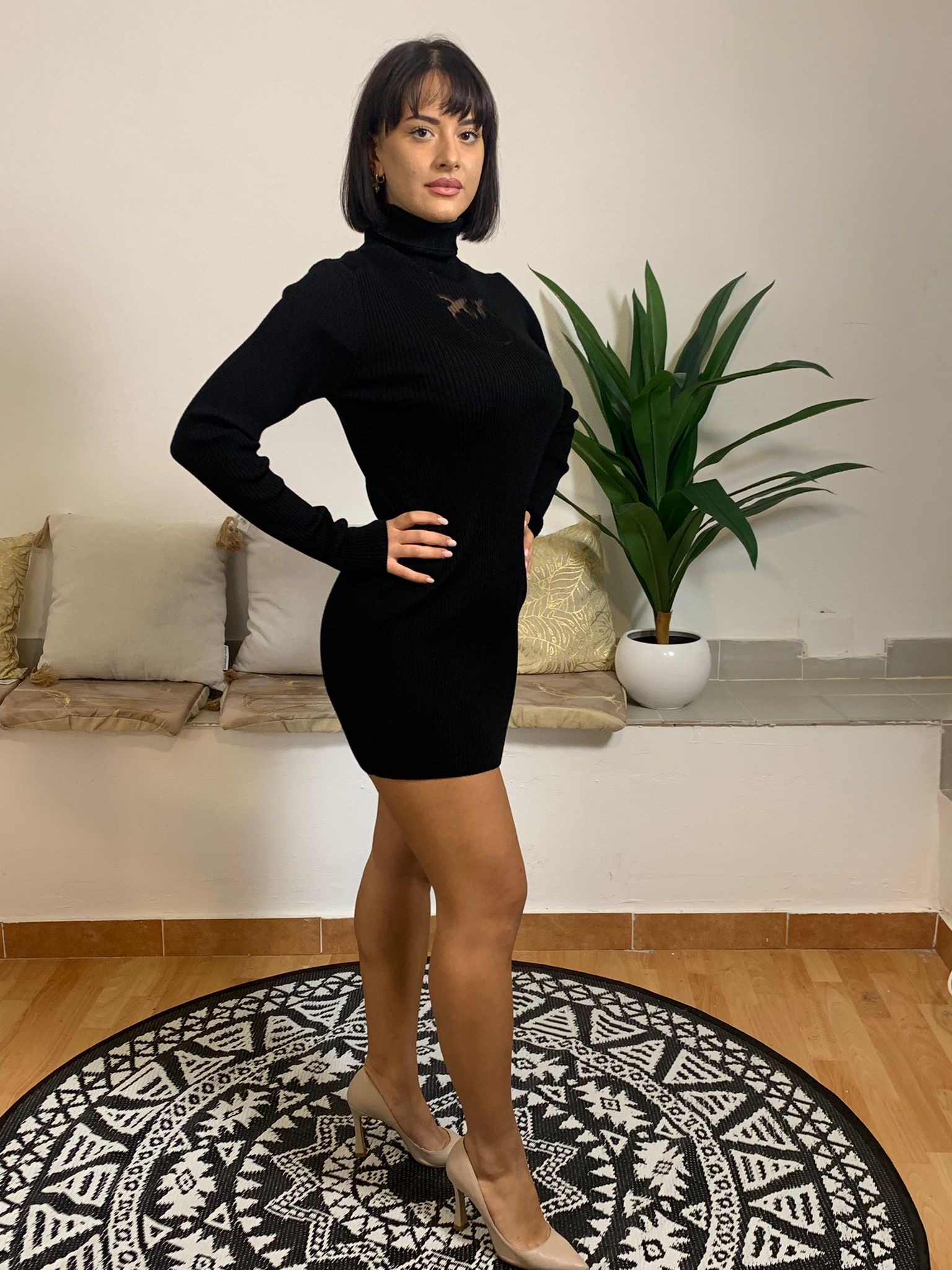 Abito nero Pinko a costine con collo alto, caratterizzato da un logo trasparente sul davanti. Realizzato in un mix di 52% poliammide e 38% poliestere, offre una vestibilità elegante e confortevole. Indossato dalla modella HE LO, alta 170 cm e con un peso di 62 kg.
