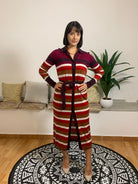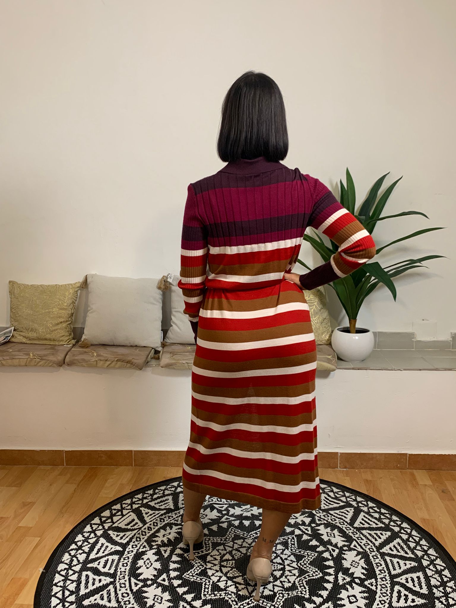 Vestito lungo a righe colorate, caratterizzato da una chiusura frontale con bottoni che si estende dalla scollatura fino quasi alle caviglie. Presenta un colletto elegante e una cintura tinta a contrasto che richiama i colori del tessuto. Realizzato al 100% in lana, offre qualità e comfort raffinati. La modella indossa la taglia ideale, con un peso di 62 kg e un'altezza di 170 cm.